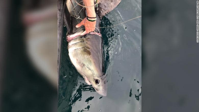 Dopo che il team è riuscito a rimuovere l’anello, hanno raccolto alcuni campioni, attaccato un segnalatore alla pinna dorsale dello smeriglio e lo hanno rilasciato in acqua, sperando di poter documentare il suo recupero.
