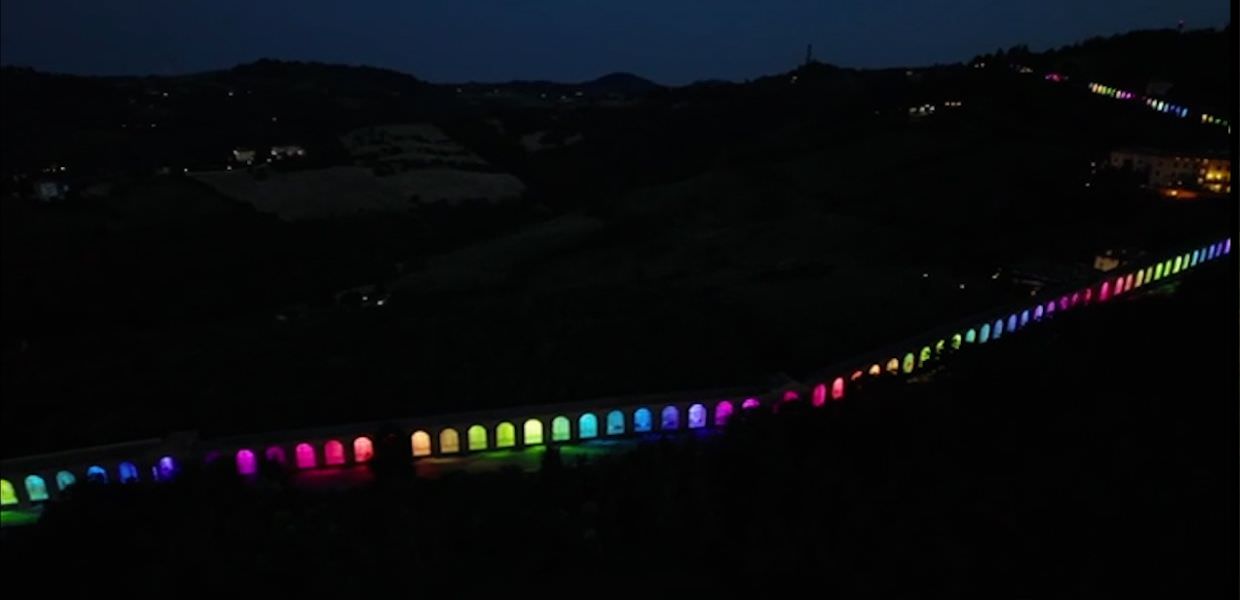 A Bologna, le luci e la musica del palco di Cesare Cremonini illuminano, per la prima volta, i famosi archi del portico di San Luca, i più lunghi al mondo, da poco dichiarati Patrimonio Unesco.