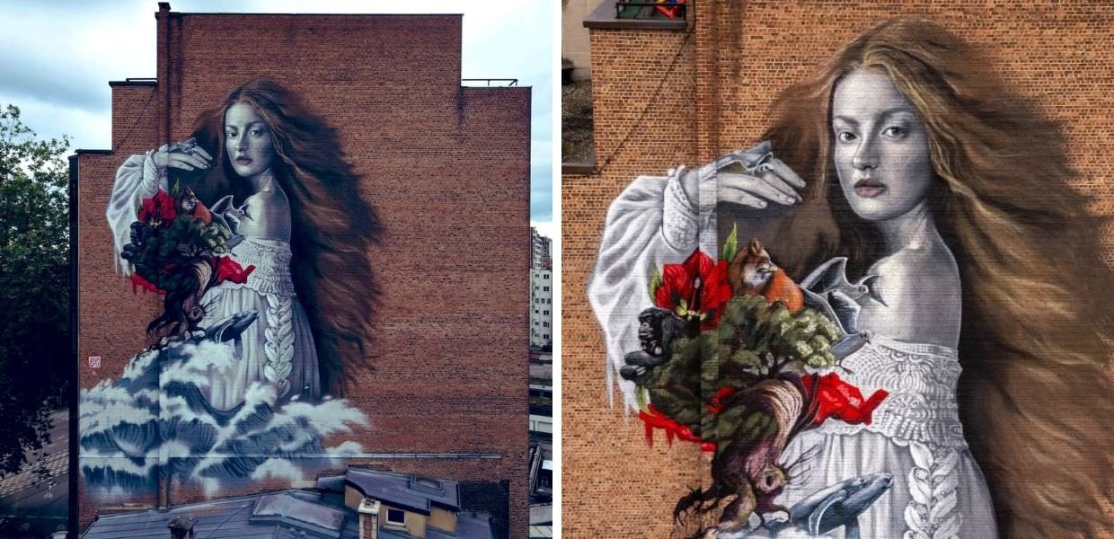 Un affresco di 40 metri di altezza è comparso sulla parete di un palazzo in rue Louise a Bruxelles. L’opera, realizzata dall’artista spagnola Lula Goce, s’intitola ‘l’alchimista’ e rappresenta Madre Natura che si prende cura e protegge l’ambiente.