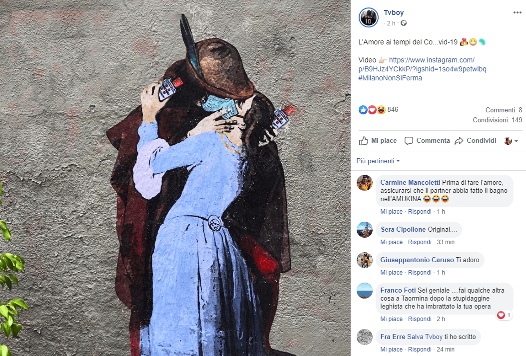 I due amanti del celebre quadro “Bacio” di Francesco Hayez rappresentati con mascherina e Amuchina. Questa è la nuova opera realizzata dallo street artis Tvboy a Milano. L’artista ha postato le foto sui suoi profilo social accompagnata dal post: “L’Amore ai tempi del Co..vid-19”, insieme a l’hashtag #MilanoNonSiFerma.
