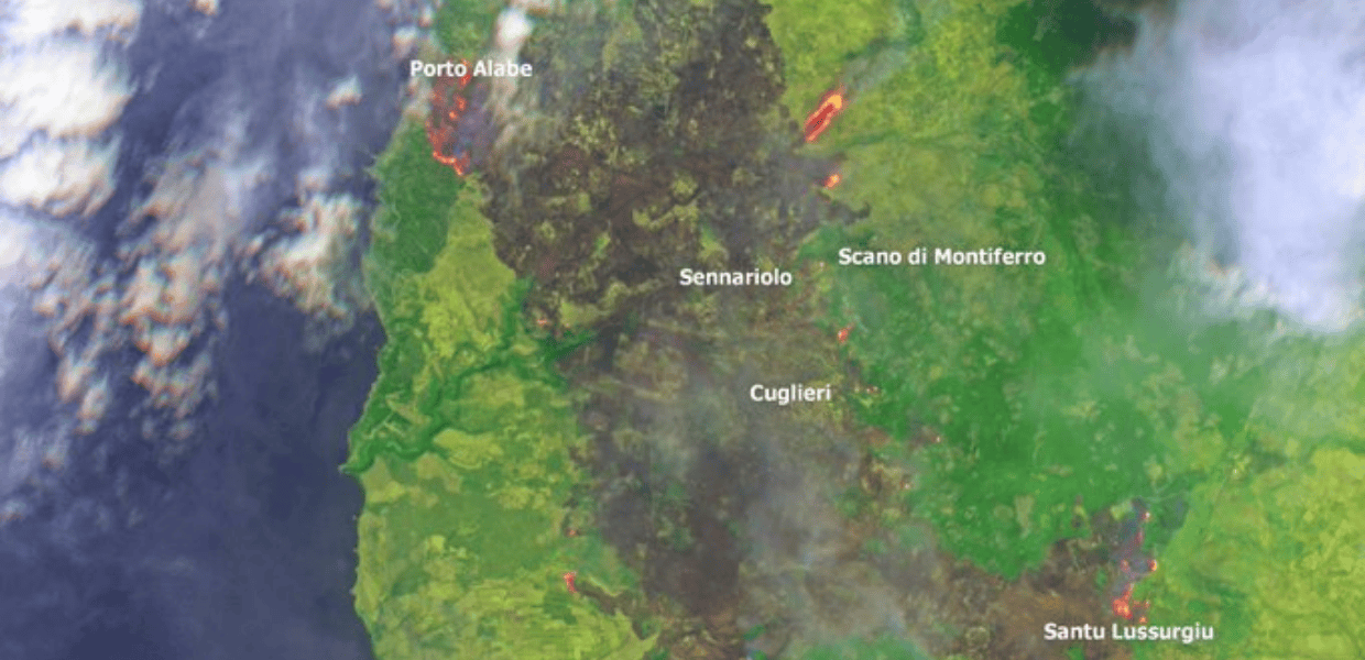 Incendi in Sardegna, un dramma di proporzioni così vaste da poter essere visto anche dal satellite. Sono sconcertanti le immagini diffuse dai satelliti di Copernicus Sentinel, che hanno ripreso dallo spazio la provincia di Oristano, colpita dal disastro. Lì, dove il satellite dall’alto immortalava paesaggi verdi per la presenza di boschi e macchia mediterranea, tutto ha cambiato colore.
