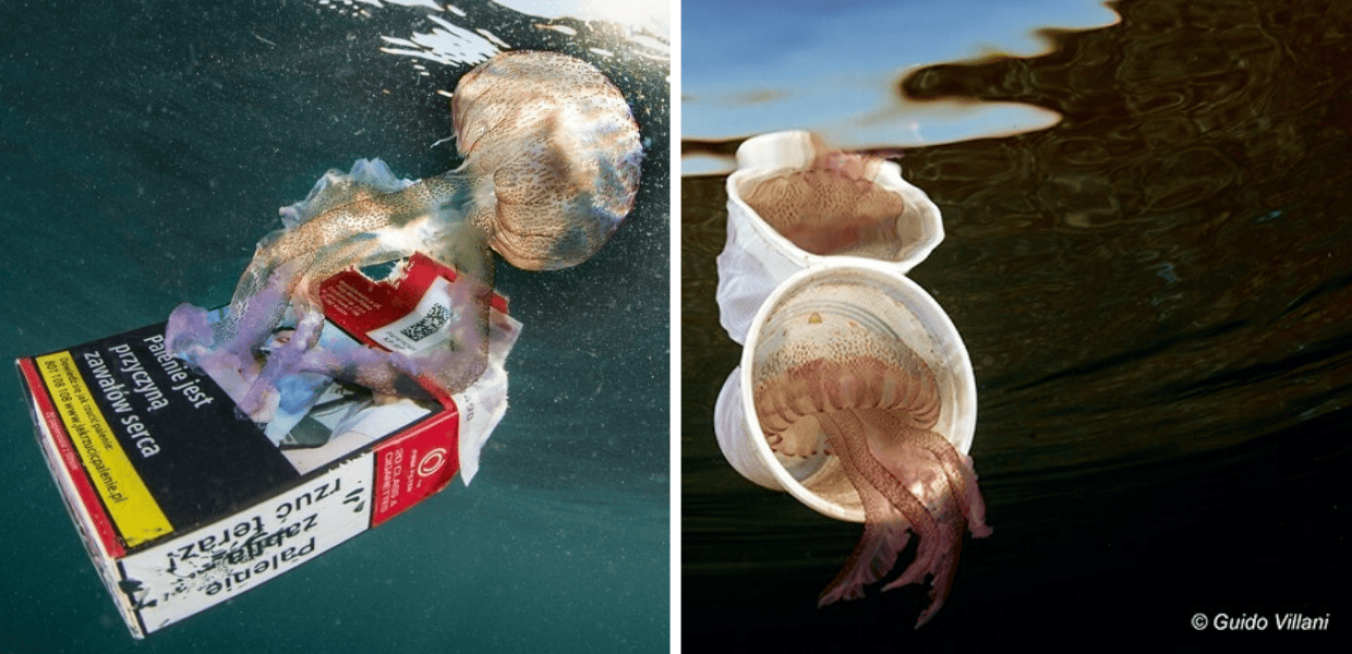 La foto, realizzata dal fotografo subacqueo Guido Villani e riportata sul quotidiano la Repubblica, ritrae una medusa, una Pelagia noctiluca, mentre afferra con i tentacoli un pacchetto di sigarette gettato da poco in acqua nel mare antistante il molo Garibaldi a Bacoli, nell’area flegrea del golfo di Napoli.