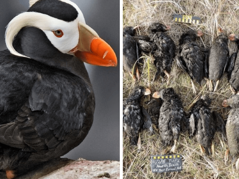 Nell’autunno del 2016, proprio nel Mar di Bering, cominciarono a spiaggiarsi dei pulcinella di mare dai già morti o in uno stato di completa debilitazione. In pochi mesi gli scienziati accorsi per capire a cosa era dovuta la moria contarono nell’area interessata pulcinella di mare e altri uccelli marini morti nel giro di pochi mesi. Dalla ricerca emerse che i pulcinella di mare erano morti di fame perché i pesci di cui si cibano erano migrati verso nord a causa dell’aumento delle temperature del mare.