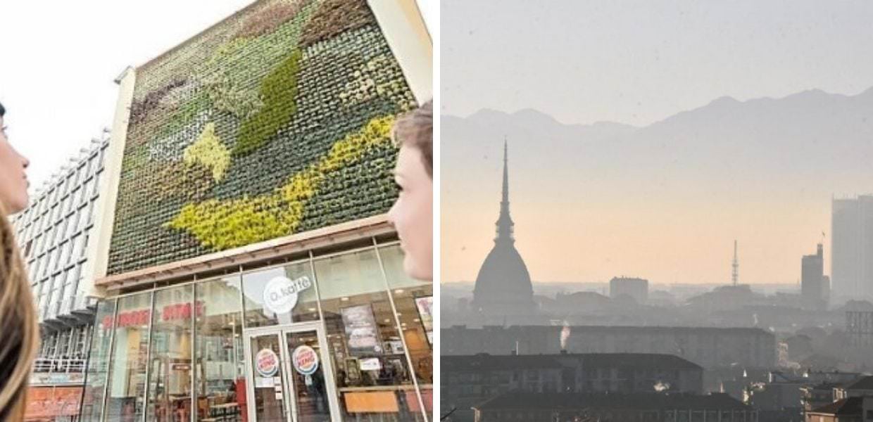 Una sorta di muro antismog posizionato su una delle pareti del complesso Aldo Moro, affacciato sull’area pedonale fra via Sant’Ottavio e via Verdi a Torino.