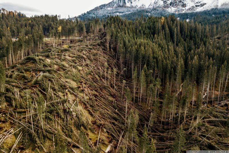 In quei terribili giorni di fine ottobre la tempesta Vaia ha danneggiato 20.000 ettari di superficie in Trentino, un volume complessivo di oltre 4 milioni di metri cubi di bosco, principalmente nell’area orientale della provincia, sopra i 1.200 metri. Una quantità di piante abbattute pari al legname solitamente tagliato in 9 anni.